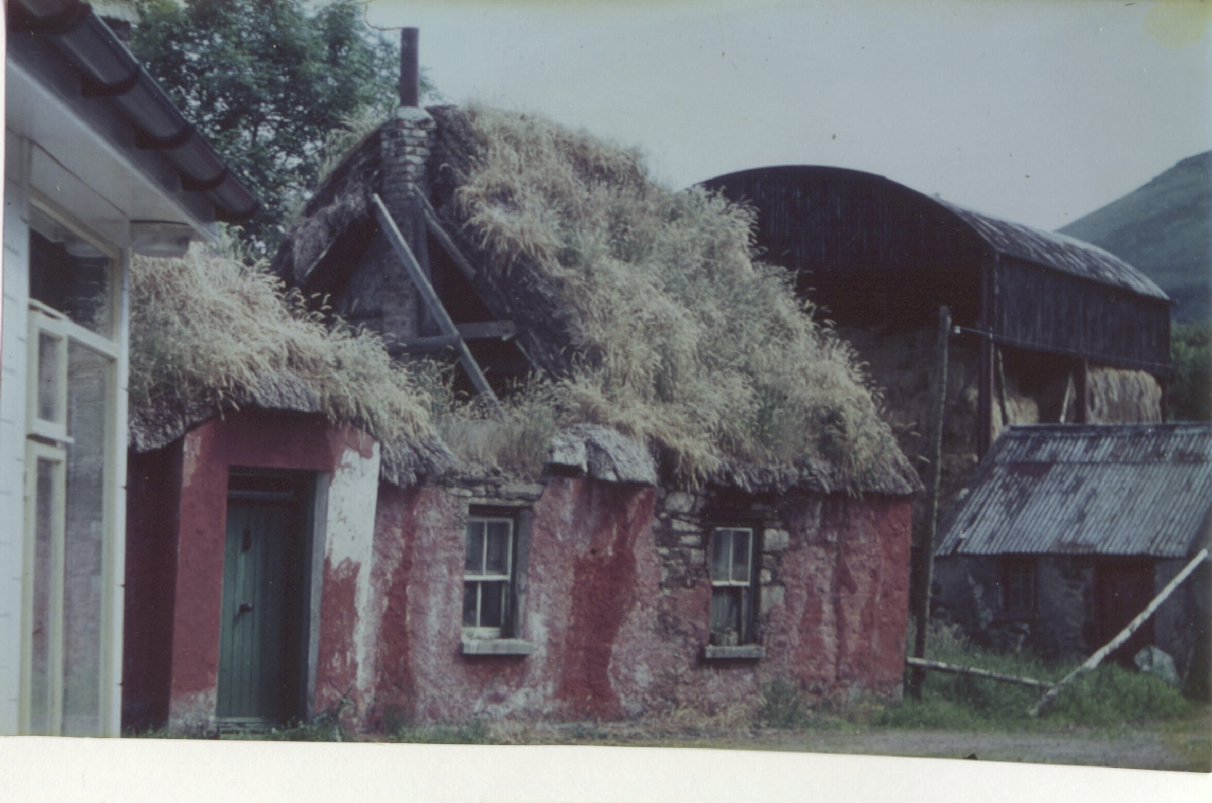 The photo (above left) from around 1912 shows the farmhouse as being a classic Irish single-story thatched house. It was described in the 1911 Census of Ireland as 3 rooms occupied by 4 people, with 3 outbuildings.