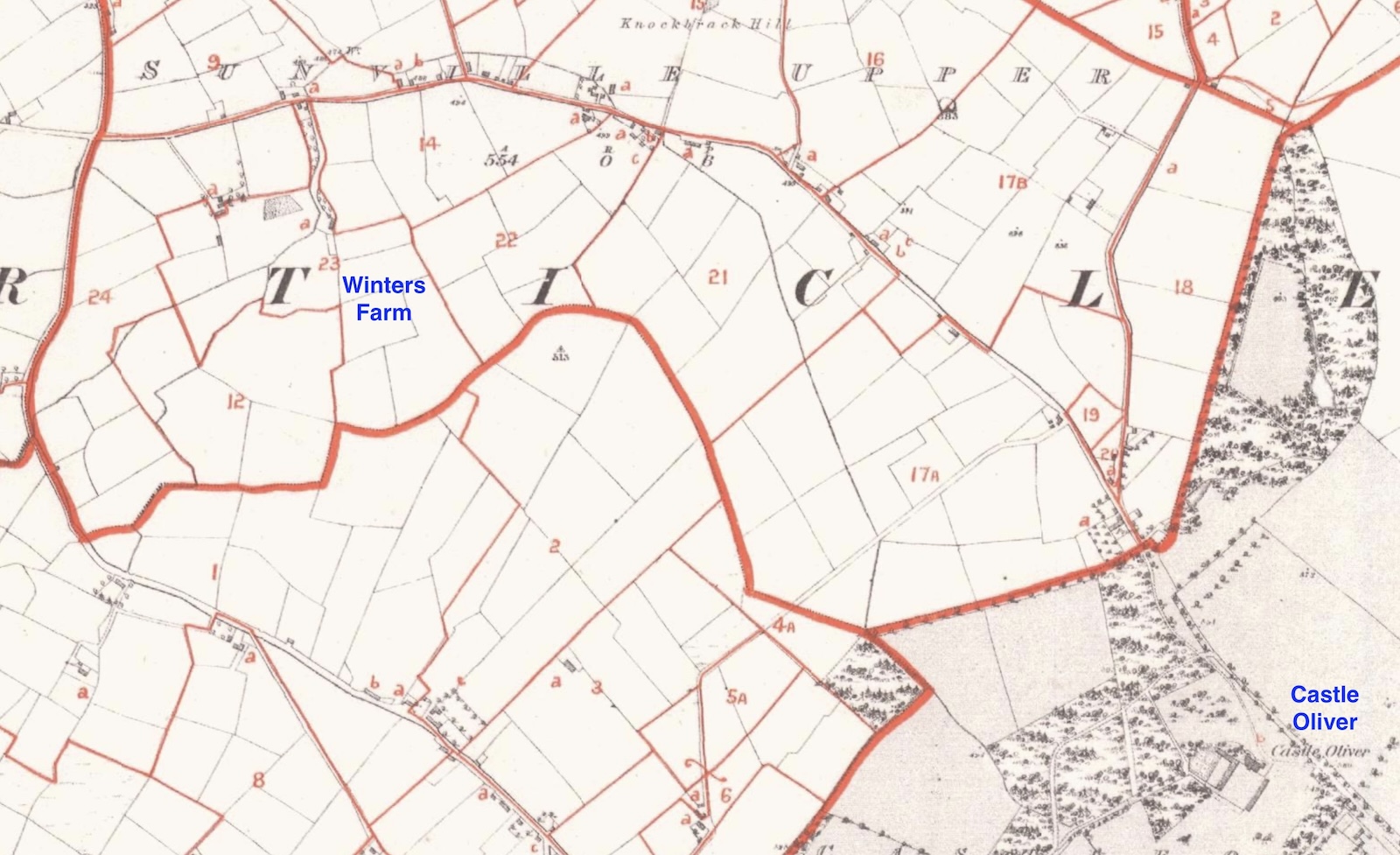 The following map from 1852 shows the location of the farm as plot number 23 with its boundary marked in red. The farmhouse itself is marked by the lower case letter “a” inside the plot. The close proximity to Castle Oliver itself in the lower right of the map is apparent.
