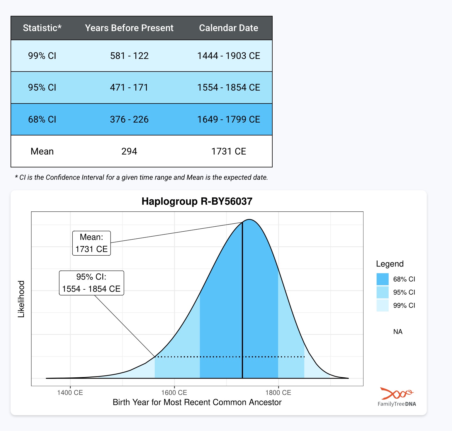 The Big Y-700 test provides a range of years during which that common ancestor might have lived, with varying levels of likelihood. The results are shown in the graph below. Significantly, the mean value for the date is 1731, suggesting that the common Cork-Limerick ancestor lived only one or two generations before the earliest known ancestors Thomas and John Winter of the two lines.