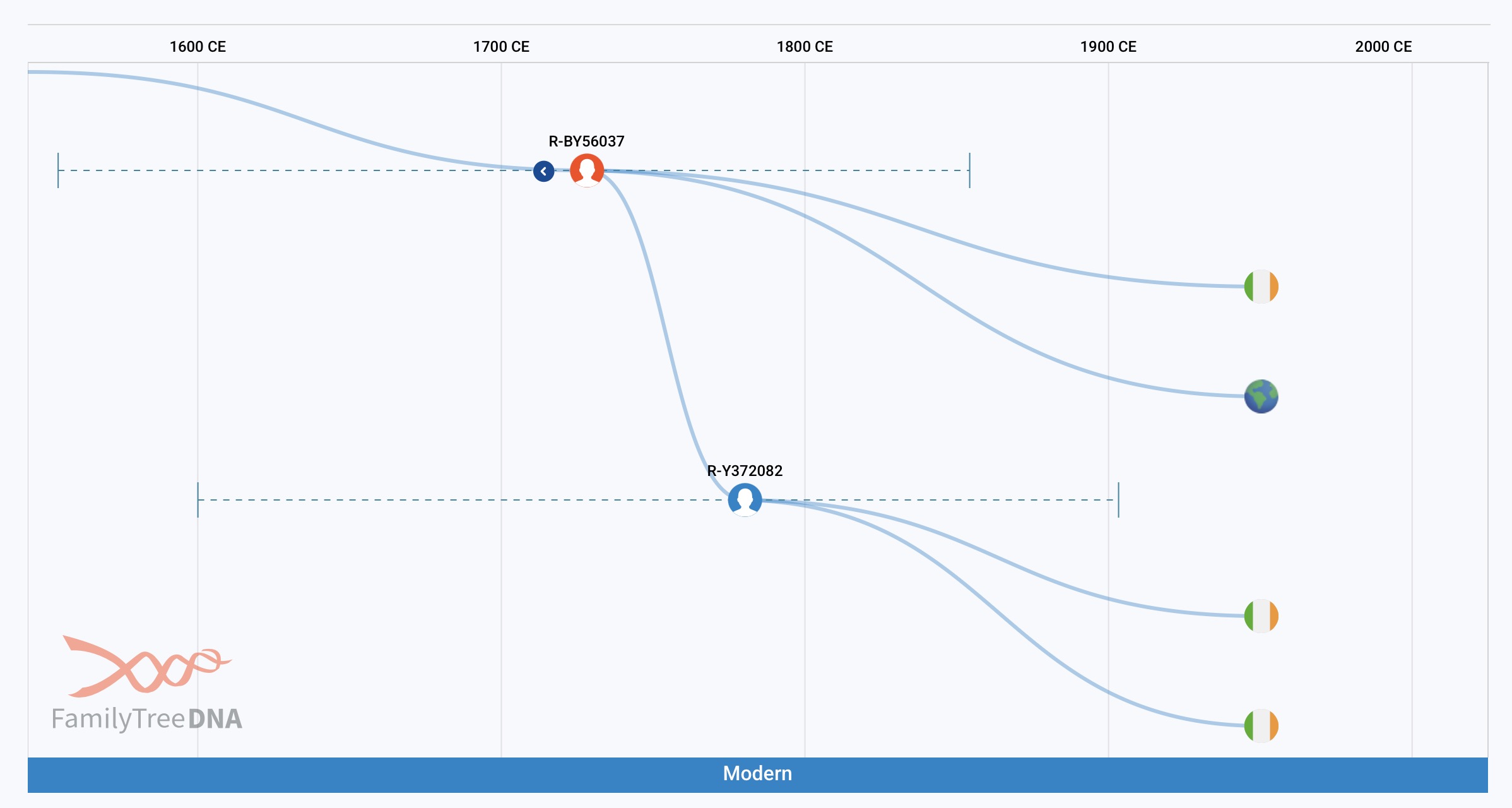 Four Winters(s) descendants tested with Big Y-700: two from the Castle-Oliver Winters family line and two from Co. Cork Winter(s) families. Their results showed a close match between the two lines, identifying a common ancestor with haplogroup R-BY113346.1 The genetic time tree below shows that the two Co. Cork Winter(s) testers also shared a more recent common ancestor with haplogroup R-Y372082.