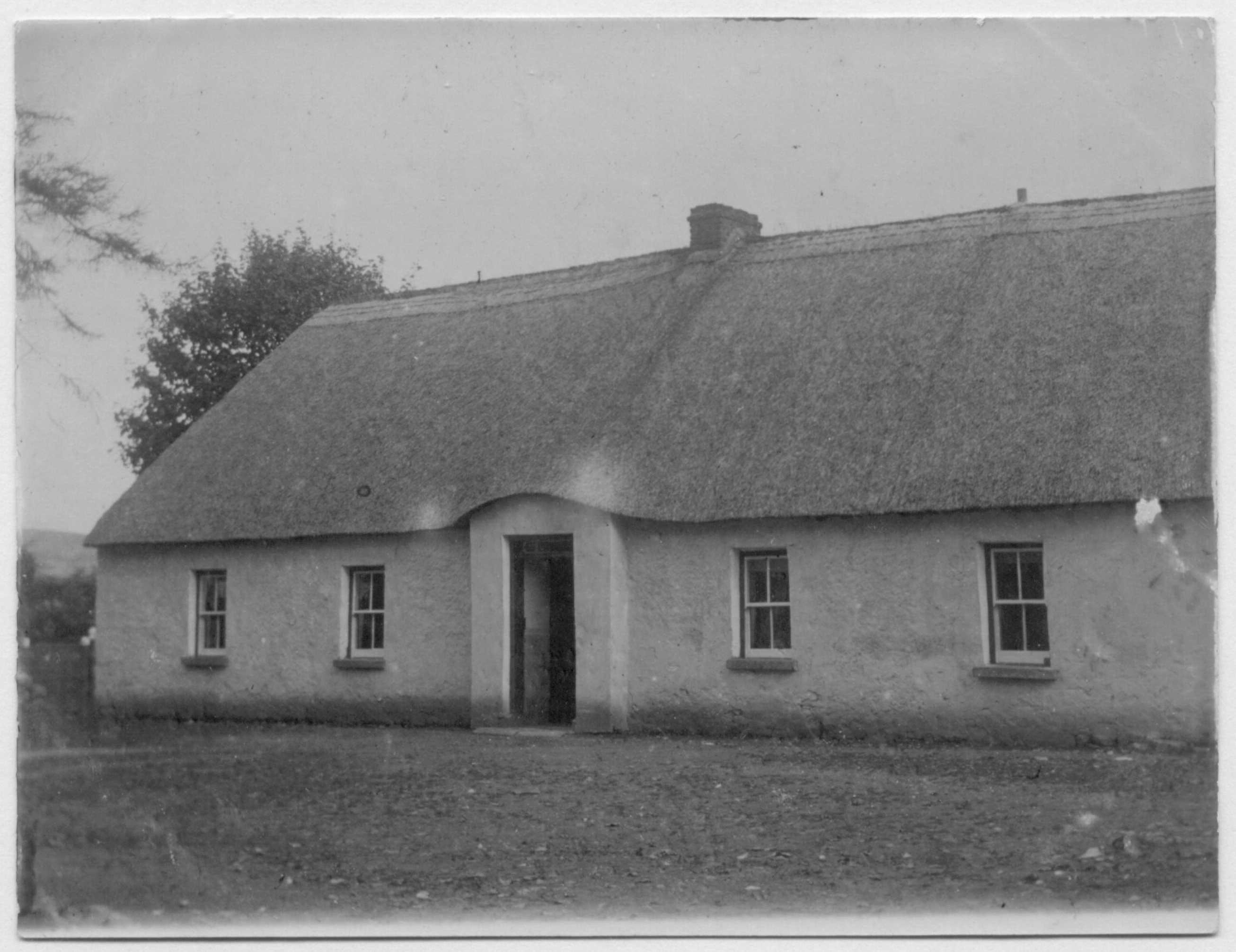 The photo (above left) from around 1912 shows the farmhouse as being a classic Irish single-story thatched house. It was described in the 1911 Census of Ireland as 3 rooms occupied by 4 people, with 3 outbuildings.
